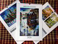 A wall-hanging A3 ( 297 x 420 mm ) sized calendar . The calendar is printed on good quality 170 gsm silk finished paper and each month has one or two of Bryan's distinctive paintings or etchings for you to enjoy .